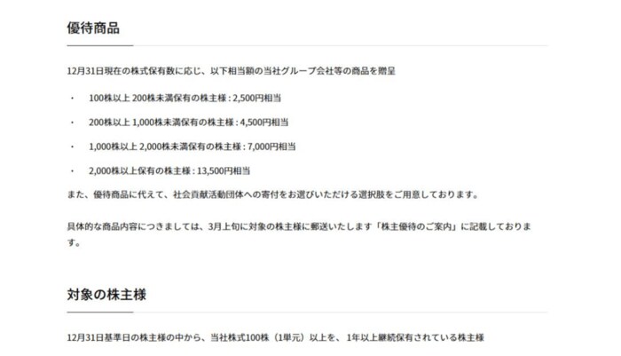 ただし、2022年2月14日に2023年の株主優待商品の発送をもって、株主優待制度の廃止を発表しています。