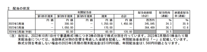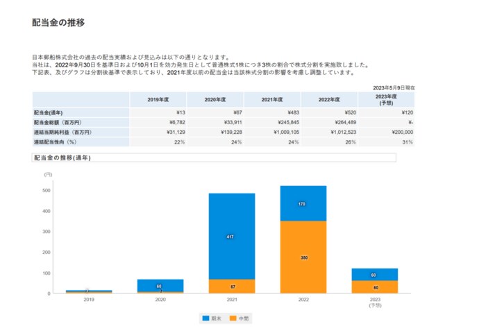 日本郵船の株式を1年前に買い、持ち続けたとすると、「2023年3月期の中間配当」と、「2023年3月期の期末配当」の計2回を受け取ることができます。