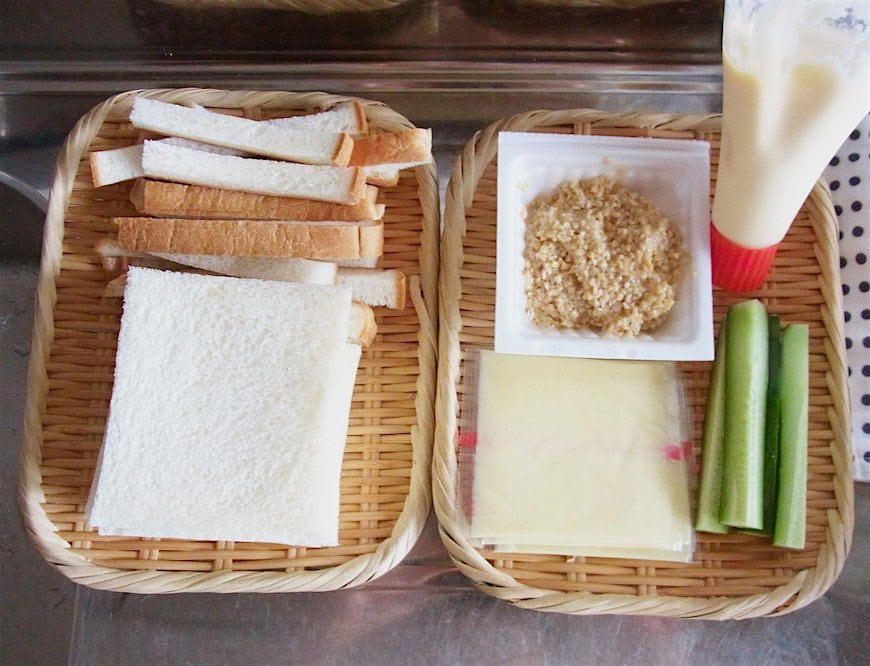 - 広げたラップの上に食パンをのせ、マヨネーズを塗ってスライスチーズをのせ、一枚につき1の納豆の1/4弱ときゅうりを一切れのせる。