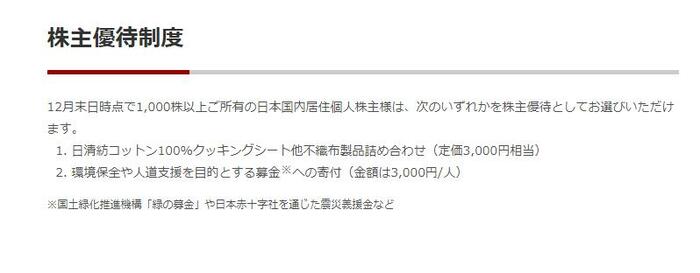 日清紡ホールディングスは、12月末日時点で1000株以上所有の国内居住個人株主に対し、下記のいずれかを株主優待として贈呈している。