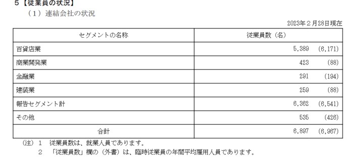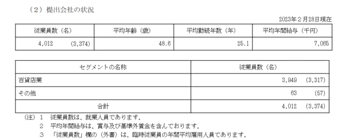 高島屋(提出会社)の2023年2月28日時点での従業員数、平均年齢、平均勤続年数および平均年間給与は以下の通りです。