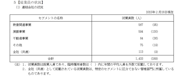 松竹(提出会社)の2023年2月28日時点での従業員数、平均年齢、平均勤続年数および平均年間給与は以下の通りです。