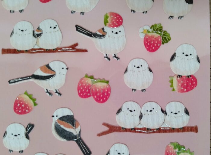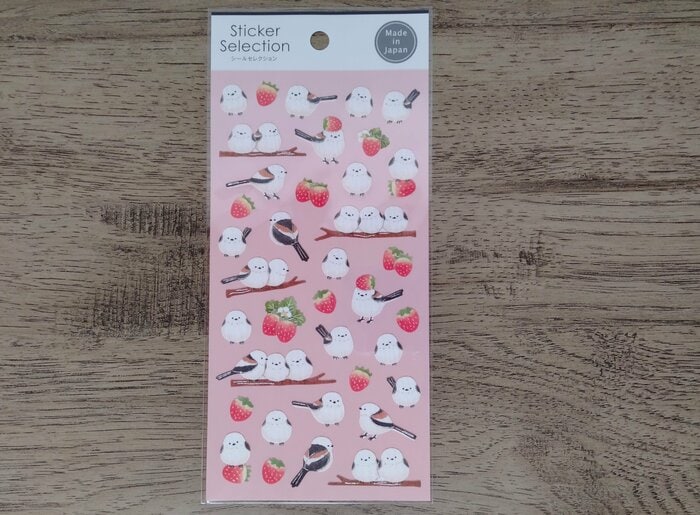 まずは、たくさんのシマエナガとイチゴデザインのシールです。シマエナガがイチゴを頭に乗せたり上に乗っかったりしているのがかわいらしいです。