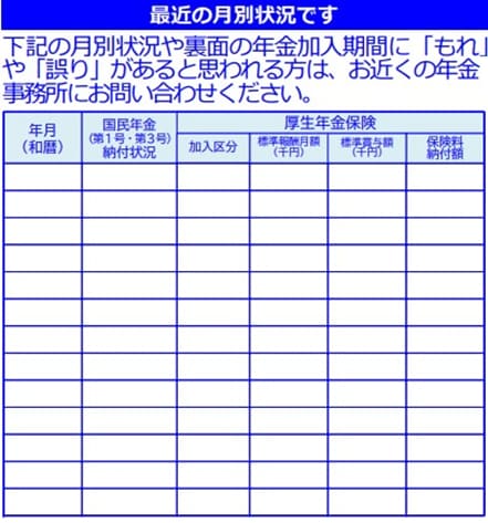 ここには、直近13か月分の国民年金または厚生年金保険料の納付状況が記録されていますので、誤りやもれがないか確認してください。特に結婚や転職などで厚生年金と国民年金の切り替えをした方は忘れずにチェックしましょう 。