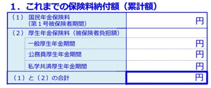 自営業や個人事業主などで国民年金保険料を納付してきた方は、(1)の国民年金保険料欄にこれまでの保険料の納付累計額が記載されています。