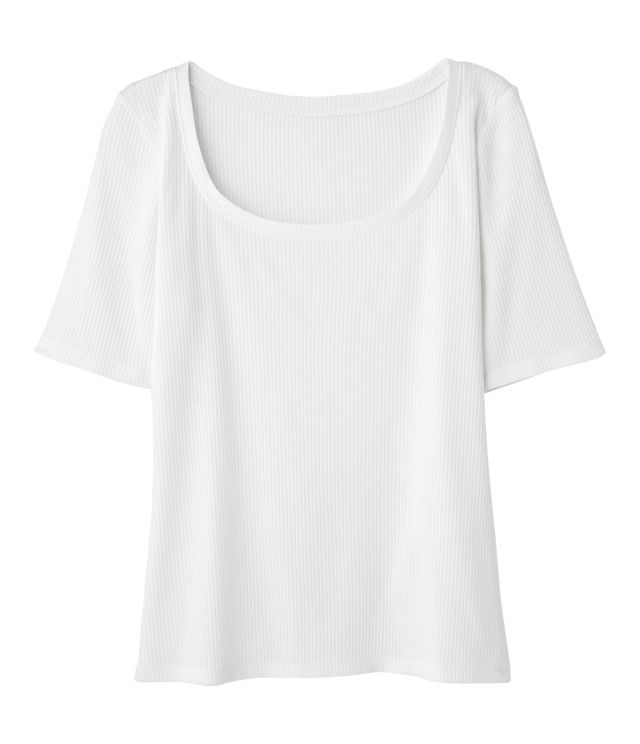 「デコルタンリブT」はデコルテを美しく魅せるためのTシャツです。二の腕を適度にカバーする袖丈で、ウエストはシェイプ。全体に縦のリブが入っている生地なので、すっきりと見えますよ。