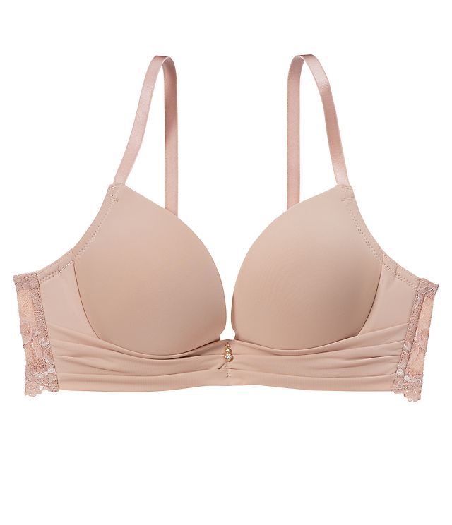「ラインレスノンワイヤーブラ」は、ノンワイヤーで楽な着け心地ながら、バストの下側に厚みのあるパッドを内蔵したカップなので、バストを寄せて上げる力も期待できます。