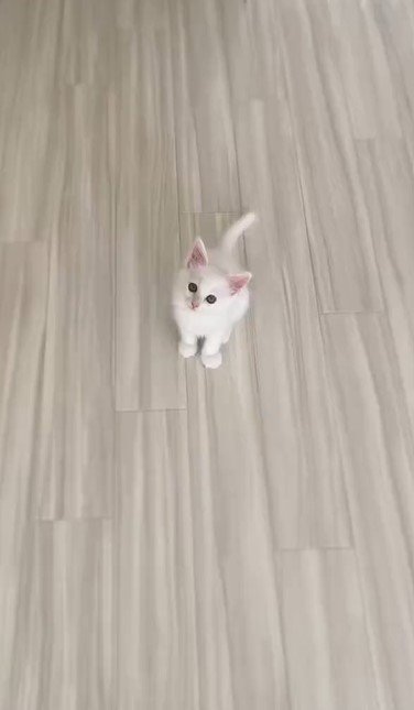 動画に写るマオくんは、フローリングの上でチョコンと腰を下ろしています。小さな身体と「パヤパヤ」とした毛並みからは子猫らしさが漂いますね。