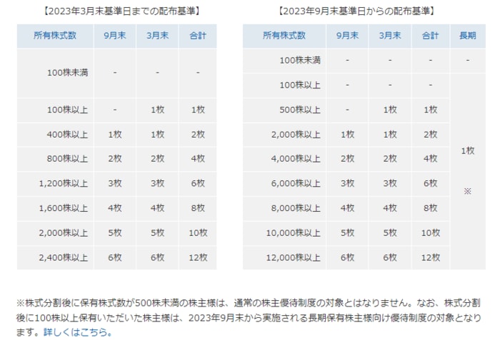 ただし、株式分割を行ったことにより、2023年9月末基準日より、株数による配布基準により異なりますので注意しましょう。