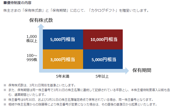 KDDIは決算期(3月31日)現在、100株以上保有する方に向けて商品カタログギフトを提供しています。