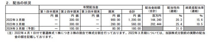 - 2023年3月期・中間配当:300円
