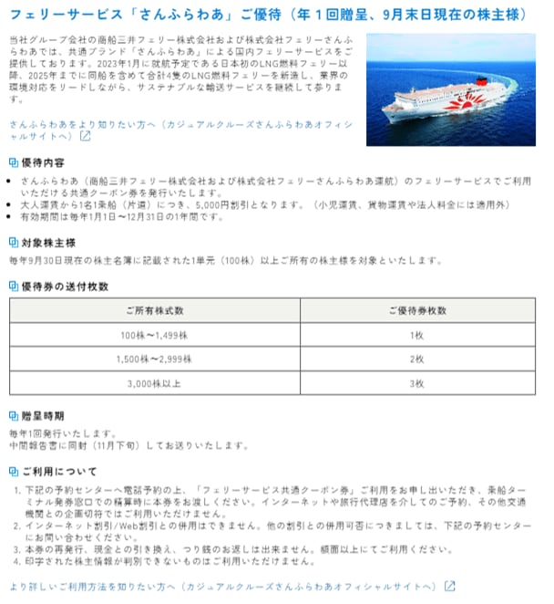 商船三井は決算期(2023年3月期)現在、100株以上保有する方に向けて「にっぽん丸」クルーズ優待を3月9月の年2回2枚ずつ、フェリーサービス「さんふらわあ」優待を9月の年1回1枚提供しています。