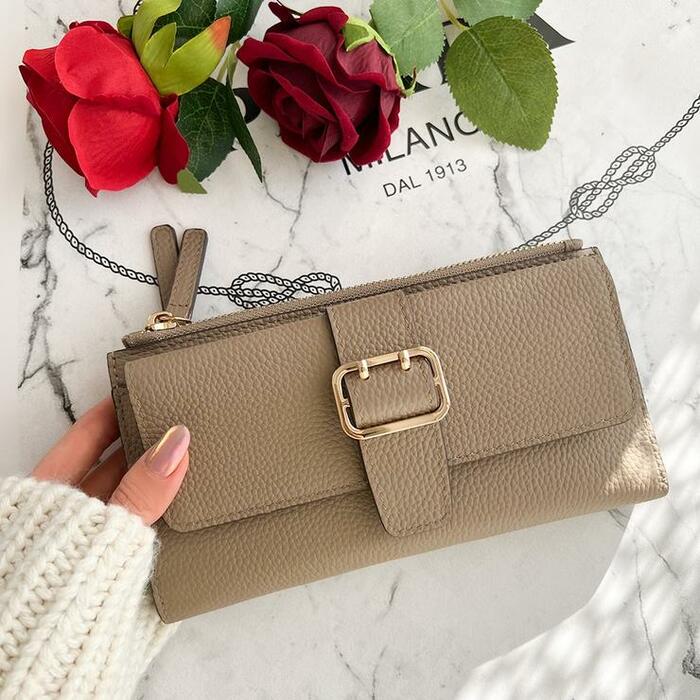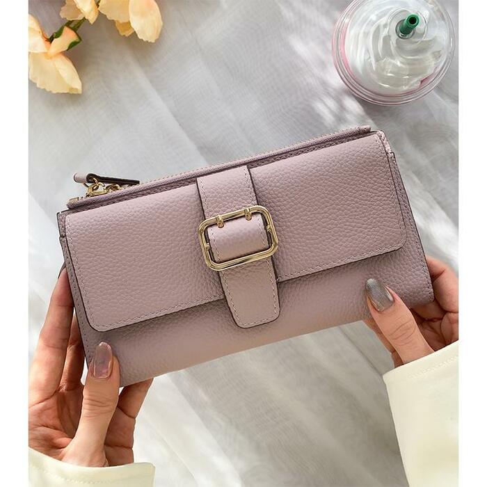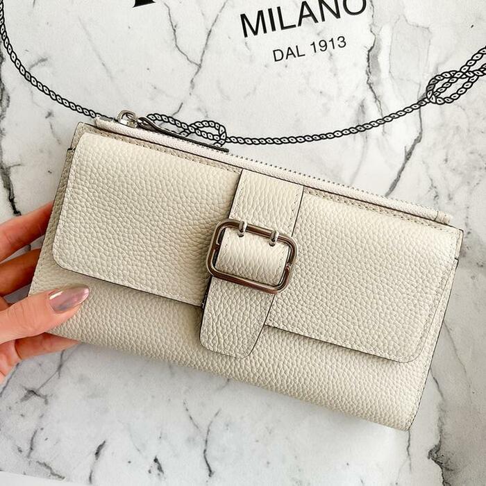 また、デザイン性もよいフロントのベルトデザインがポイントで、スマートに持てる長財布タイプなのもおしゃれですね。本革ならではの触り心地の良さと軽さが楽しめます。