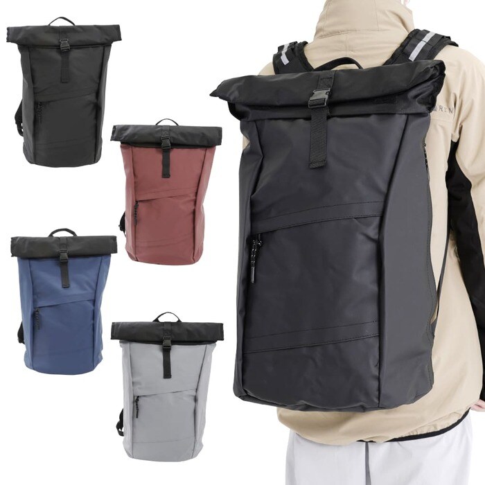 シンプルなデザインの防水リュック。リュック上部の収納口はロールトップ仕様になっているので、中身が飛び出しにくくなっています。
