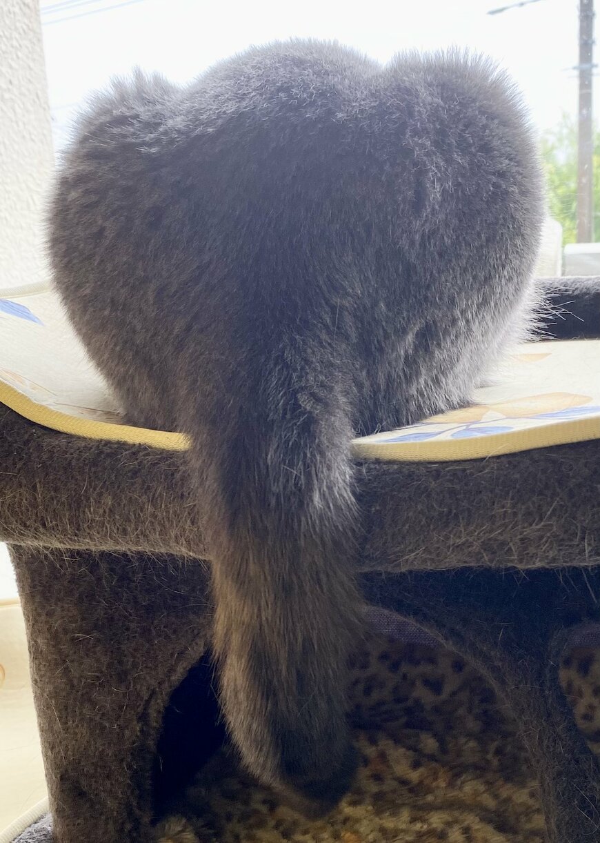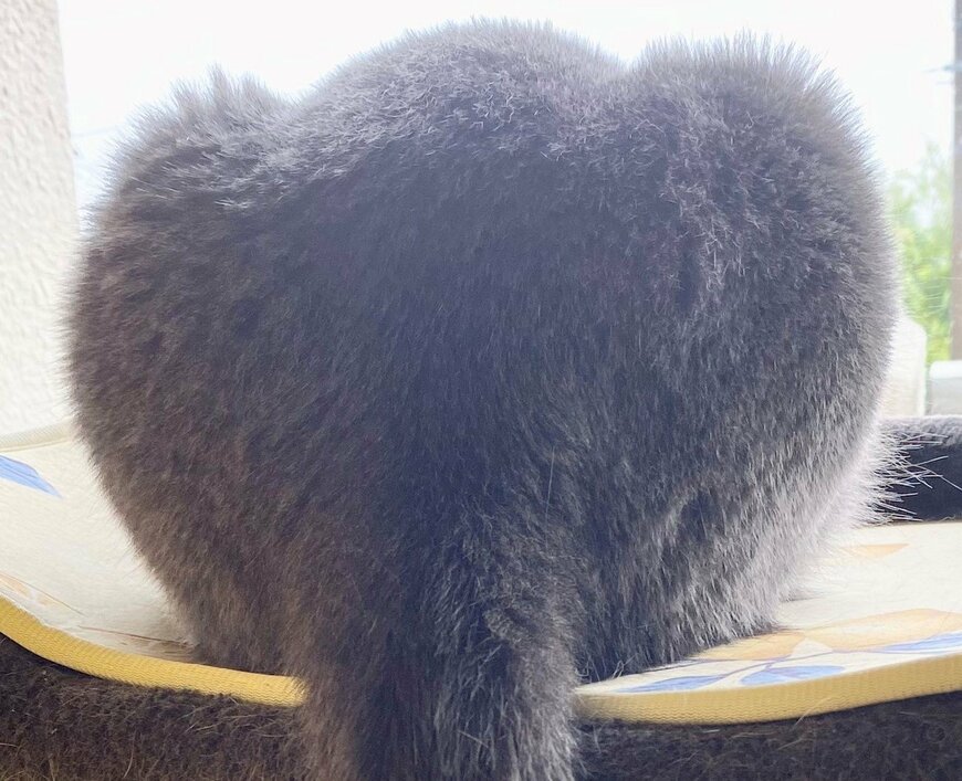 そこに写っているのは、グレーのつややかな毛並みが印象的な猫ちゃんの後ろ姿。こちらに背を向けて、香箱座りをしているのでしょうか。モフッとしたお尻のフォルムが、ゾウの「耳とお顔」を想起させます……!