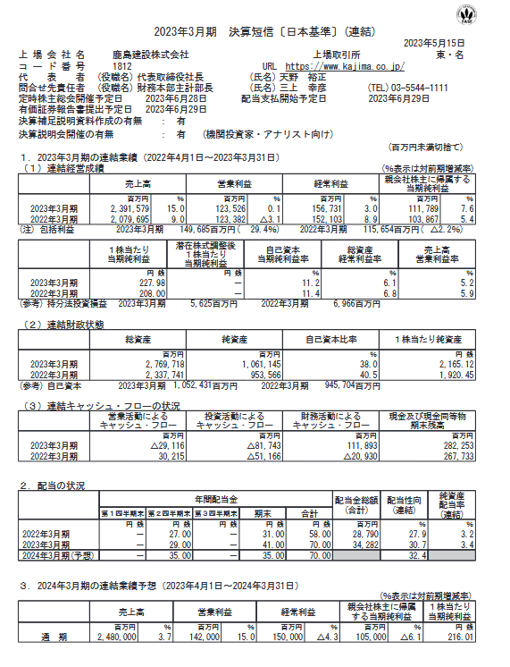 鹿島(1812)の株価は下落。配当利回りは3.4%(2023年5月30日・株式取引概況)