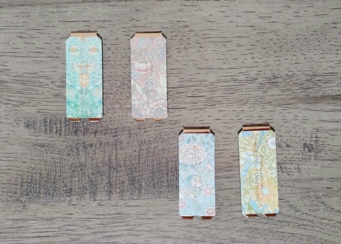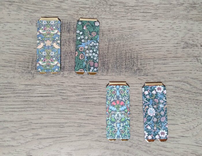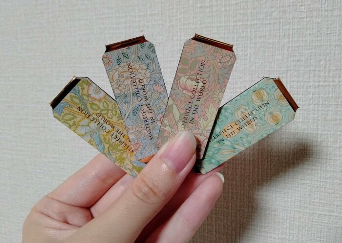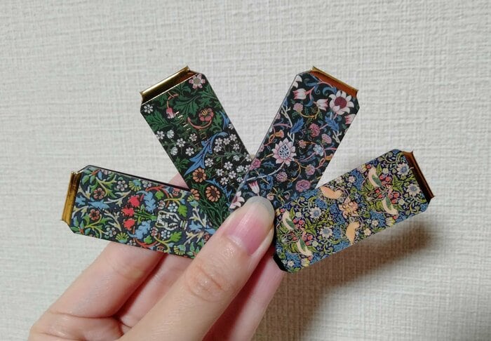 こちらがセリアで販売されているモリスデザインの栞です。写真のように1つのパッケージに4枚も入っています。美術館で販売されているアイテムのように美しいです。