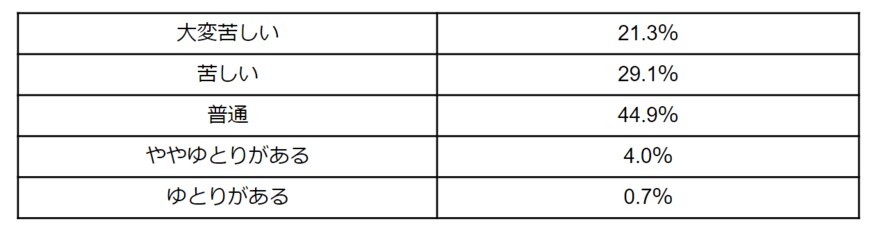 「大変苦しい」が21.3%、「やや苦しい」が29.1%、「普通」が44.9%、「ややゆとりがある」が4%、大変ゆとりがあるが0.7%でした。