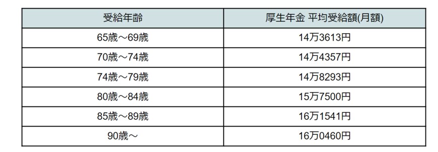 厚生年金の平均受給額は、65歳から70代後半までは14万円台で、80歳代になると15万円を超え、80歳代後半が最も高額となっています。年齢が高くなるほど受給額も高額になる傾向があるようです。