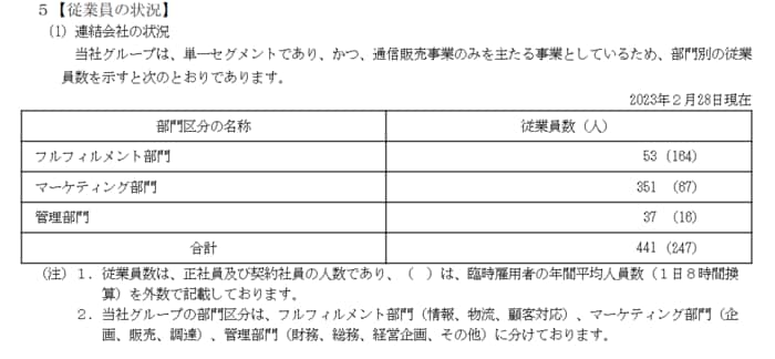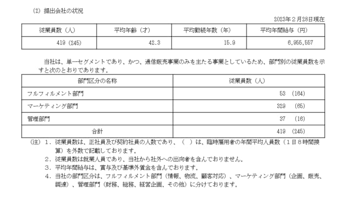 フェリシモ(提出会社)の2023年2月28日現在での従業員数、平均年齢、平均勤続年数および平均年間給与は以下の通りです。