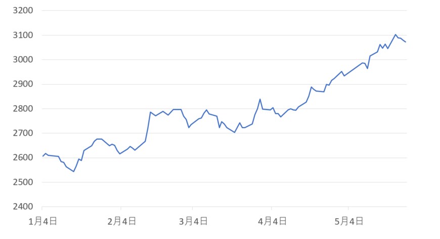 JT(2914)の株価は年初来ほぼ一貫して右肩上がりの推移となっています。5月には株価は3000円を突破し、2023年初日の1月4日~5月26日の間で17.8%の上昇率となっています。