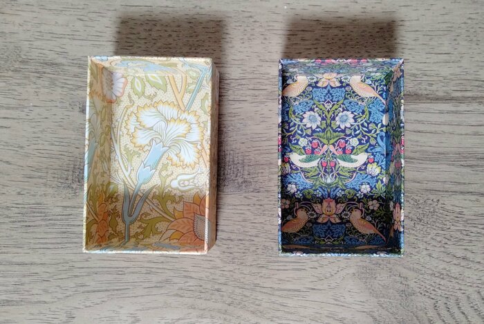 セリアで販売されているモリスデザインのお道具箱を紹介してきました。1/2サイズの細長トレーや1/4サイズの長方形トレーも一緒に販売されています。