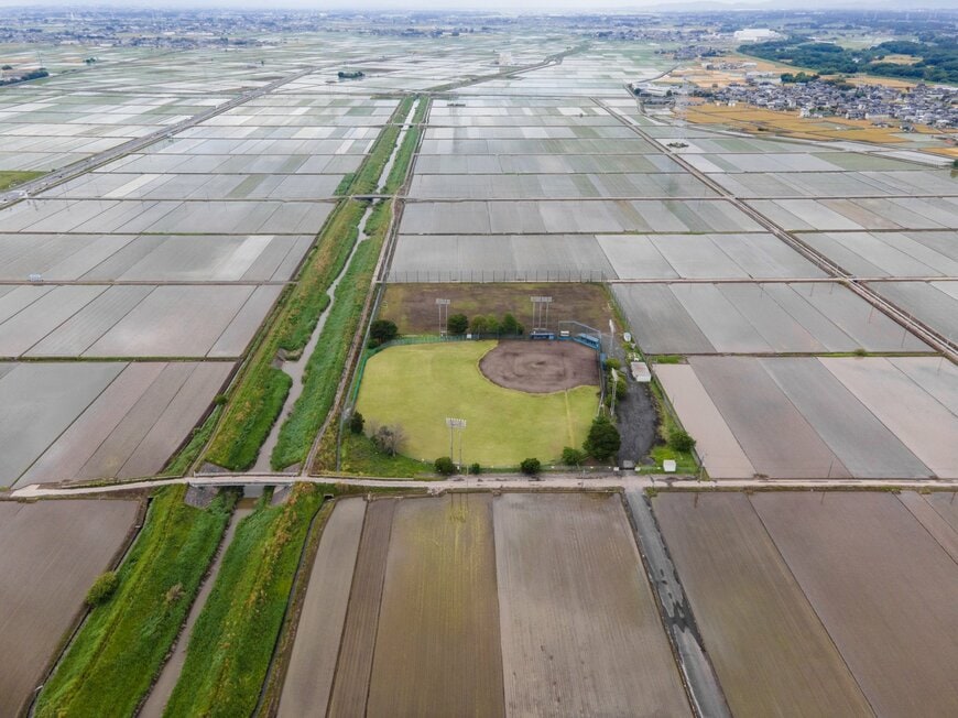 「田んぼの真ん中のポツンと球場、場外ホームランは田んぼへ。」というコメントとともに投稿されたのは、広大な田んぼの中に野球場だけがポツンと取り残されたかのような…、思わず目を引いてしまう1枚の写真でした。