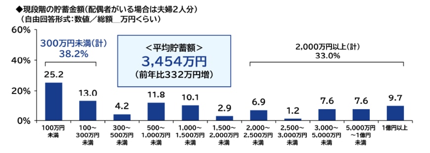 2023年に還暦を迎える人(世帯)で貯蓄が2000万円以上の割合は33%です。約3人に1人が2000万円以上の貯蓄があります。一方で、貯蓄300万円未満の人も38.2%いるため、人によって貯蓄の差は大きいです。