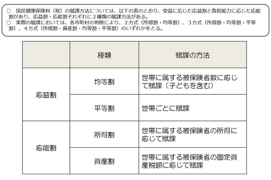 - 応益割:均等割や平等割(所得にかかわらず一律の保険料)