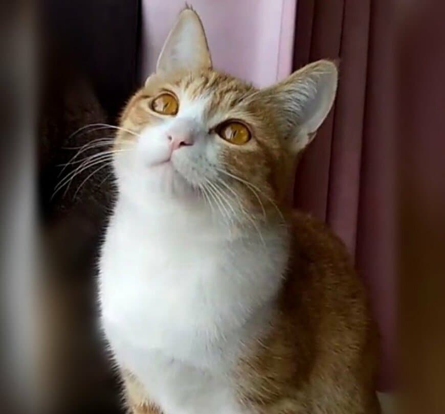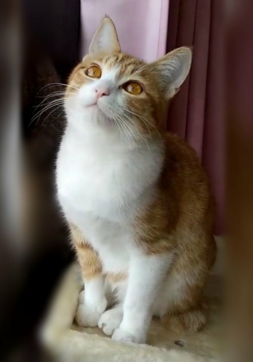 写真にうつっているのは、黄金色のおめめを輝かせながら一点を見上げるプリンちゃんの姿。その落ち着いた表情からは「美味しかったなぁ……」なんて心の声が聞こえてきそうです。プリンちゃんの満足感がたっぷり伝わる愛らしい姿は、いつまでも眺めていたくなるようですね。
