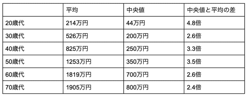 20歳代を除くと、40歳代と50歳代の中央値と平均が唯一3倍を超えています。