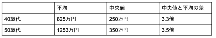 貯蓄の平均と中央値をそれぞれ比較すると、40歳代は平均が825万円で中央値が250万円、50歳代は平均が1253万円で中央値が350万円です。