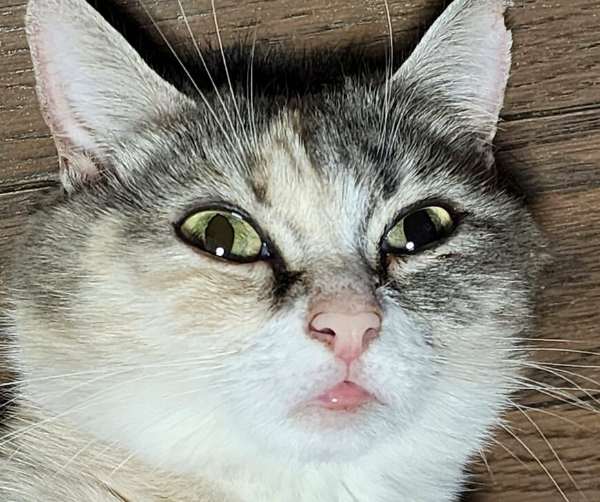 写真に写るメロンちゃんは、少々つり目のような表情を浮かべて一点を見つめています。そして口元をよく見ると、モッフリとした口元からピンク色の舌がはみ出ています……!