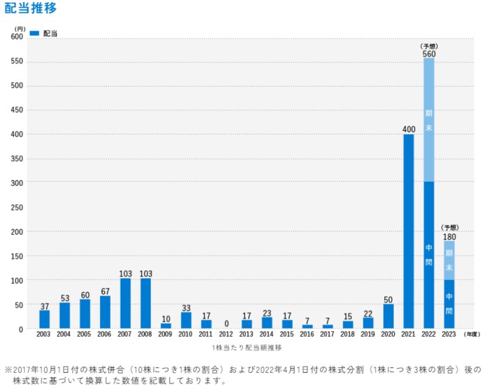 商船三井の株式を1年前に買い、持ち続けたとすると、「2023年3月期の中間配当と2023年3月期の期末配当」の計2回を受け取ることができます。
