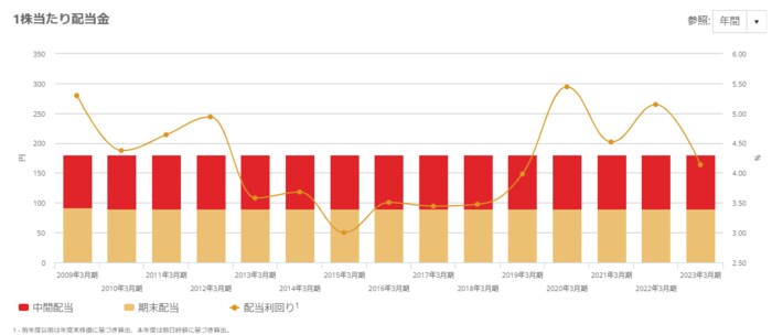 武田薬品工業の株式を1年前に買い、持ち続けたとすると、「2023年3月期の中間配当と2023年3月期の期末配当」の計2回を受け取ることができます。