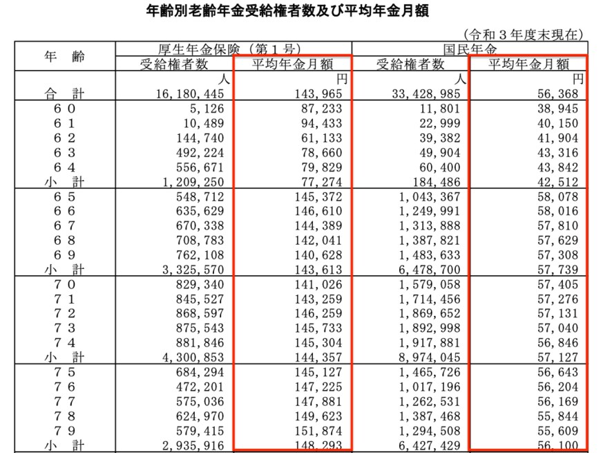 厚生労働省年金局が発表した調査データによると、60歳代以降の厚生年金保険と国民年金の平均受給額は下記の結果となりました。