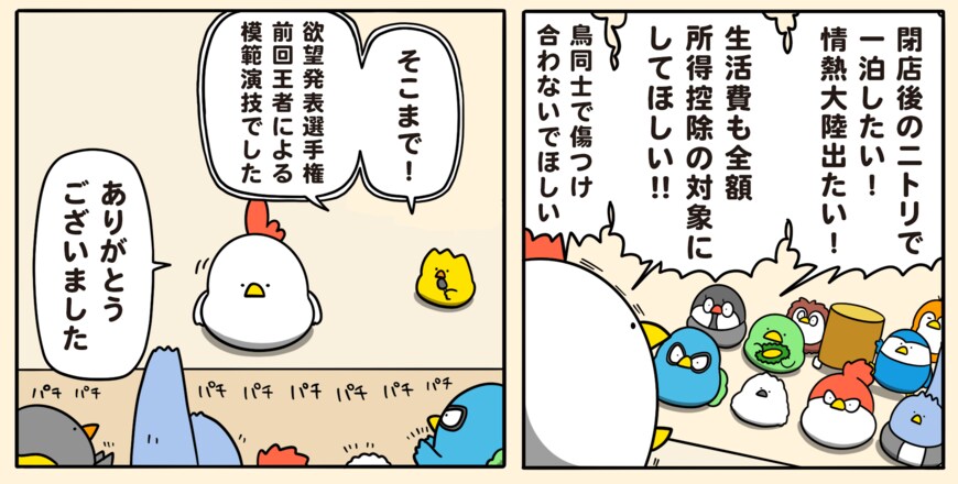 「発表」というコメントとともに投稿されたのは、ニワトリのキャラ「でぶどり」が自身の欲望を発表する様子を描いた漫画でした。