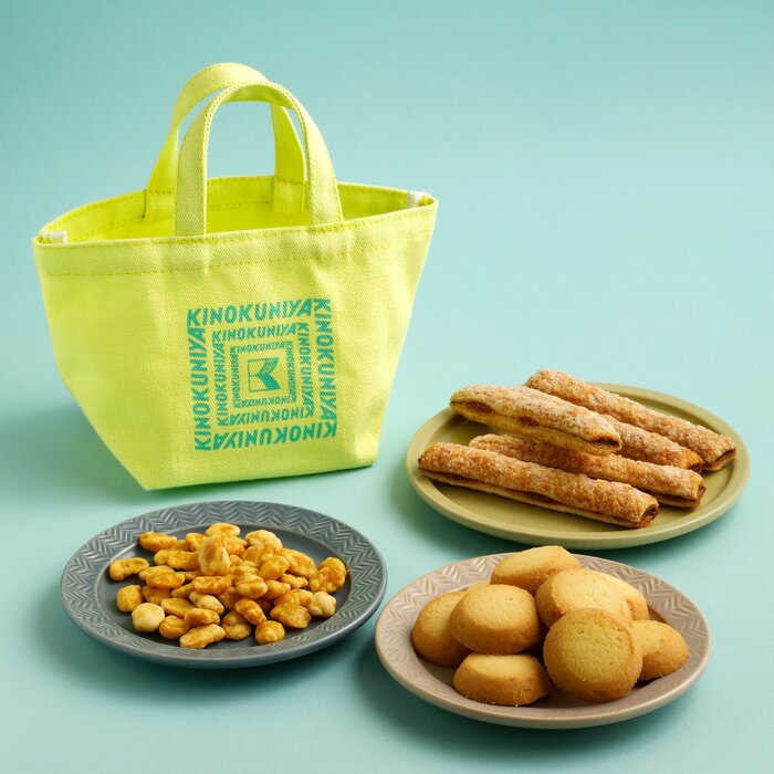 レモンの程よい酸味とサクサクのパイが好相性のレモンパイスティック、レモンの風味とほんのり塩味が絶妙なクッキーと、くせになるサクサク食感のそら豆スナックがセットになりました。イエロー生地にグリーンの文字が映えるバッグもかわいいですね。