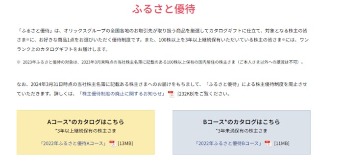 オリックスは決算期(2023年3月期)現在、100株以上保有する方に向けて「ふるさと優待」と「株主カードによる優待」を提供しています。