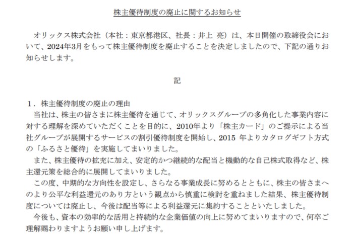 - オリックス株式会社「株主優待制度の廃止に関するお知らせ」