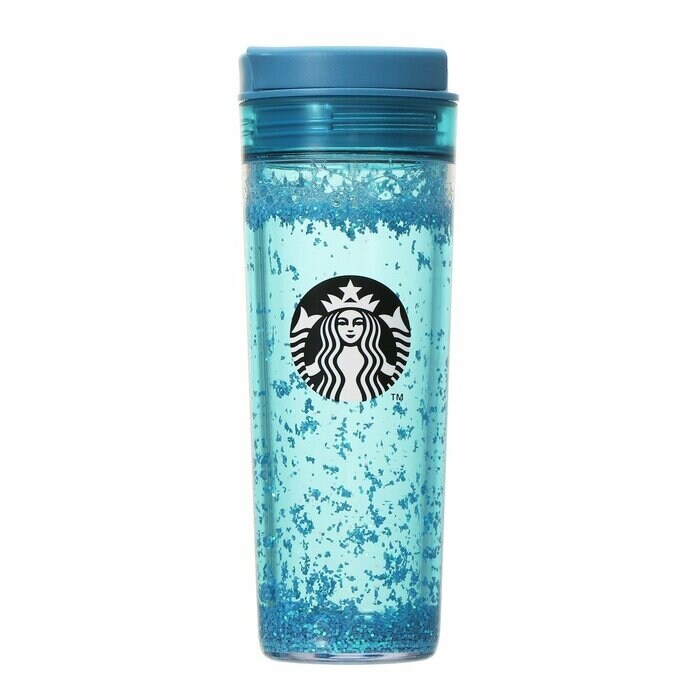 水の中でブルーのコンフェッティが輝くタンブラーです。インナーカップとアウターカップの間には水が入っていて、傾けるとブルーのコンフェッティがゆっくりと舞う美しいデザインです。
