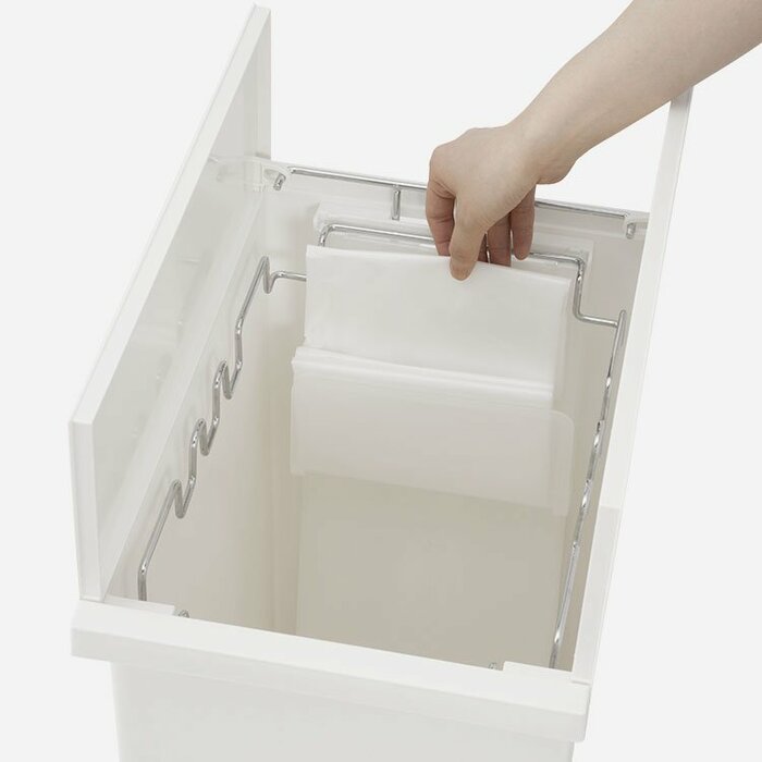 ペダル式で手軽に開けられて、開閉時の音が静かなのも特徴。45Lと大容量ながらシンプルなデザインで、キッチンに置いてもスッキリとした印象に。ゴミの分別にも対応したつくりやゴミ袋の収納ポケットつきなど使いやすい工夫がいっぱいです。