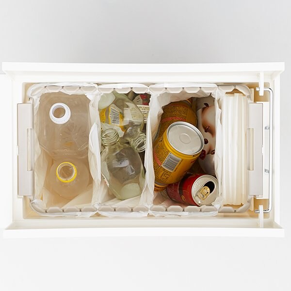 スッキリとしたデザインのゴミ箱。細かいゴミの分別が可能で、ゴミ袋がスムーズに取り出しやすい工夫もされています。