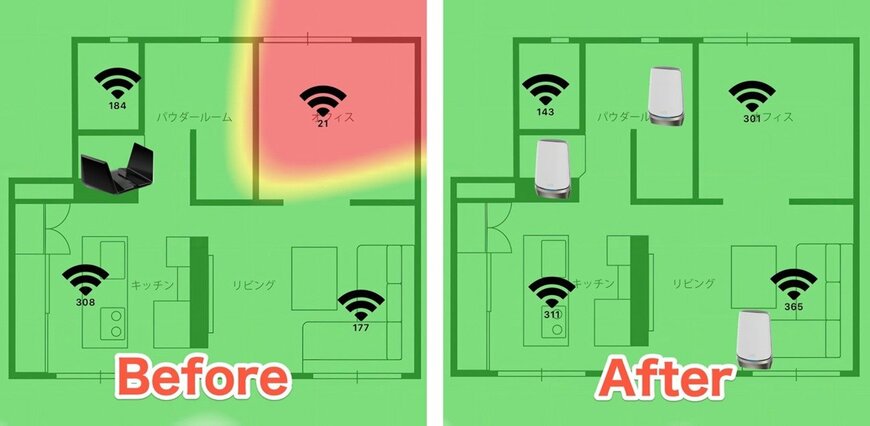 以前もNETGEAR製のルーター(4万円程度)を使っていましたが、コンクリートや鏡が多いと電波が飛ばない場所ができてしまいます。一方、今回導入した機器はメッシュWi-Fiなので安定性がダントツ。中継機での拡張と違い、近くの電波を自動で拾ってくれるので常に強い電波で通信できます。死角があった自宅環境も満遍なく通信ができるようになりました。