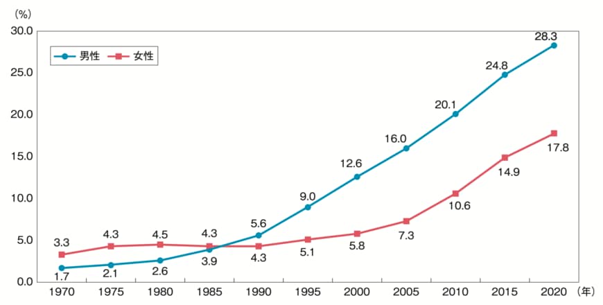 内閣府が発表した「少子化社会対策白書」によると、男女の生涯未婚率(50歳時未婚率)は1970年で男性1.7% 、女性3.3%だったのに対して、2020年には男性28.3%女性17.8%と上昇しています。