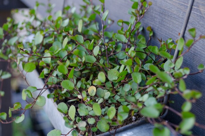 グリーンプランツにはワイヤープランツを組み合わせます。小さい葉が涼しげな雰囲気で、寄せ植えを爽やかに演出します。