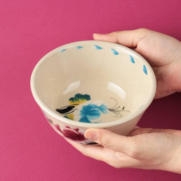 ひとつひとつ手書きされた絵柄と、重ね焼きの素材感が楽しめるベトナムの庶民的な食器「ソンべ焼き」のお椀と、ベトナムの屋台で目にするローカルフード「チェー」の素のセット。