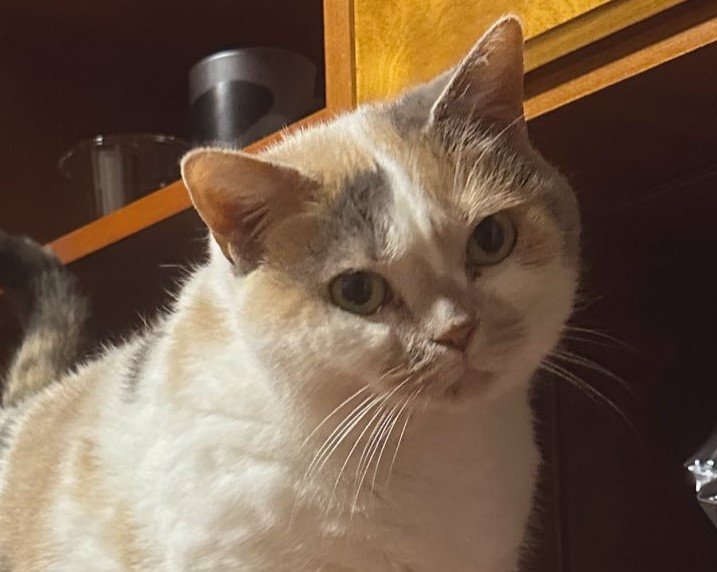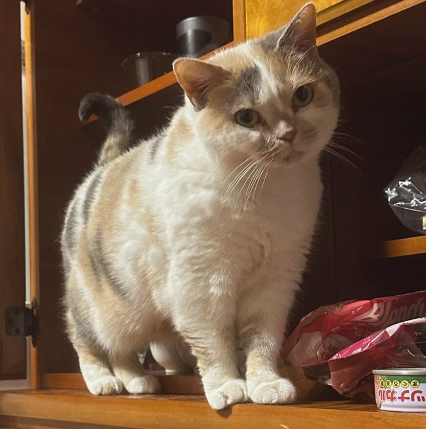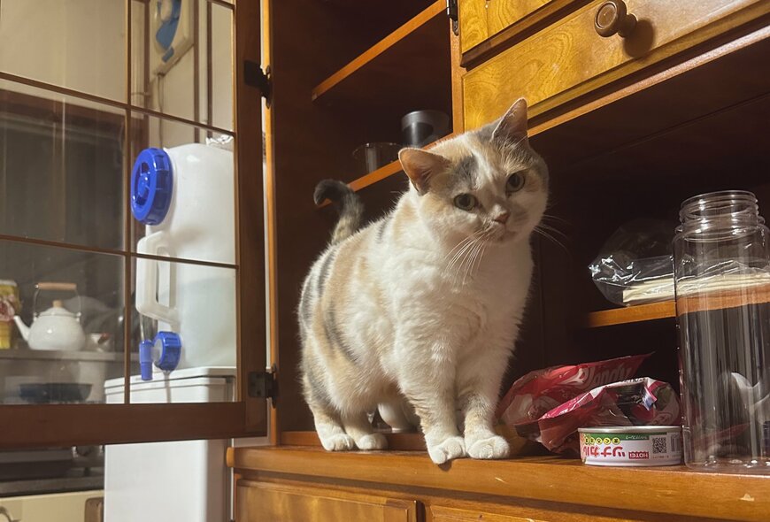 投稿したのは、富山県の海辺の町で猫ちゃんと暮らす「@sauntm」さん。写真には棚の上にチョコンと登る、1匹の猫ちゃんの姿がありました。どうやら目の前にあるツナの缶詰を見つけたようです。