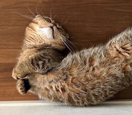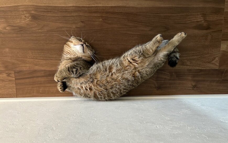ちょこんと伸ばしたおててを胸元に添えるような仕草も目を惹くポイントですね。モフモフの腹部を惜しげもなく披露するくつろぎぶりにホッコリします。まさに「ニャイキ」という言葉がピッタリとも言えそうな1枚に、自然と笑みがこぼれてしまいますね。