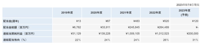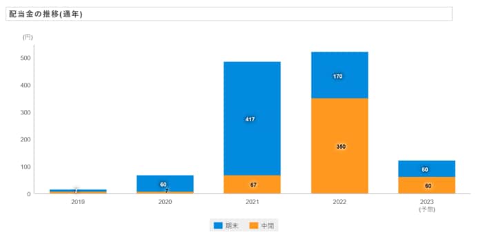2022年度は年間で520円となっており、2023年度の予想は120円です。
